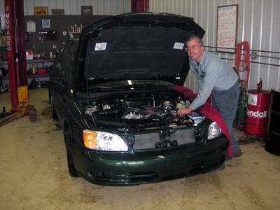 Dave in the Ridge Road Repair service garage checking out a Subaru, October 2005.